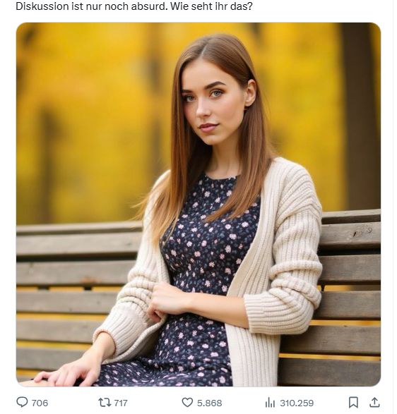 Das umfasst nicht nur erkennbar computergenerierte Darstellungen mit teils ungelenken Animationen: Auf mehreren Plattformen finden sich Profile einer KI-generierten jungen Frau, die rechtspopulistische bis rechtsextreme Botschaften und Engagement Baits, teils getarnt als Alltagsposts, streut. Einzelne Inhalte erzielen mit sechsstelligen Views hohe Reichweite. Wie aus den Kommentaren ersichtlich, halten viele Nutzer:innen die KI-Figur für eine reale Person.