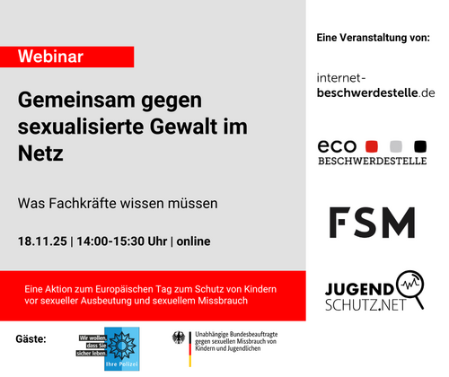 Am 18. November, dem „Europäischen Tag zum Schutz von Kindern vor sexueller Ausbeutung und sexuellem Missbrauch“ bieten die Beschwerdestellen der FSM, eco und jugendschutz.net ein Webinar für pädagogische Fachkräfte, Multiplikator:innen und Interessierte an.